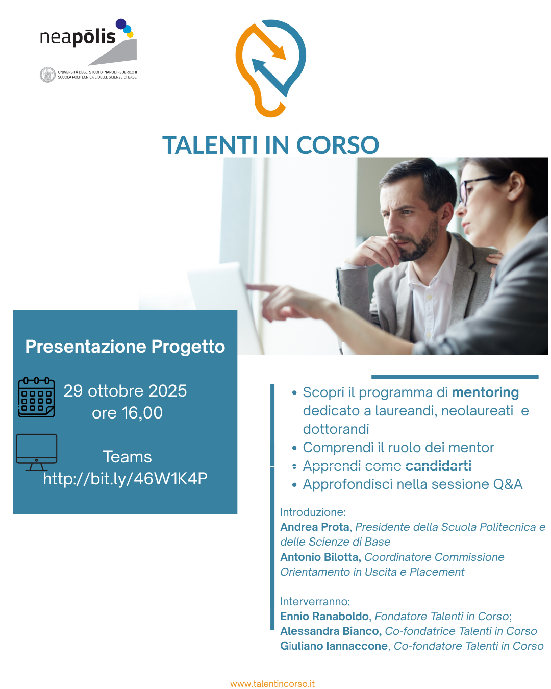 Un’importante occasione da cogliere al volo per giovani laureandi, laureati e dottori di ricerca, resa possibile grazie all’accordo tra la Scuola Politecnica e delle Scienze di Base e la libera associazione di professionisti volontari Talenti in corso. L’iniziativa è stata fortemente promossa dal Presidente, prof. Andrea Prota, insieme alla Commissione Orientamento in Uscita e Placement coordinata dal prof. Antonio Bilotta.